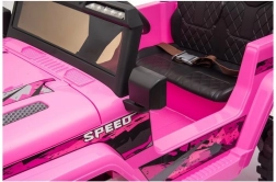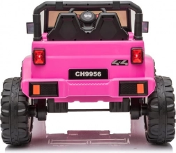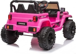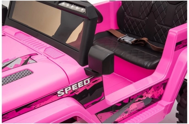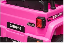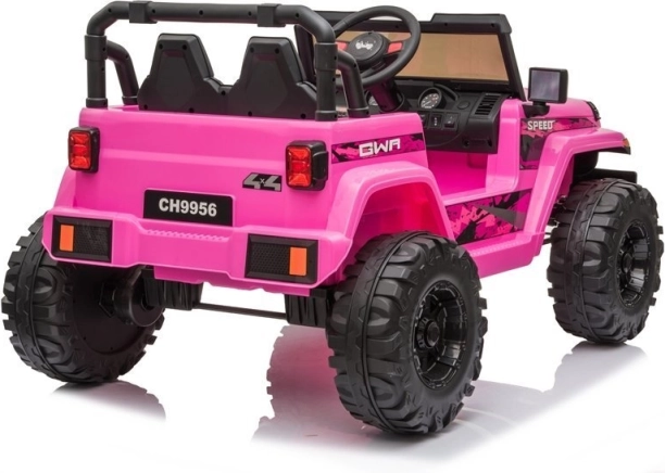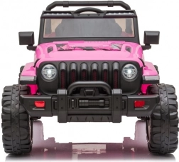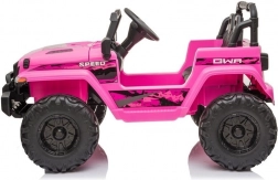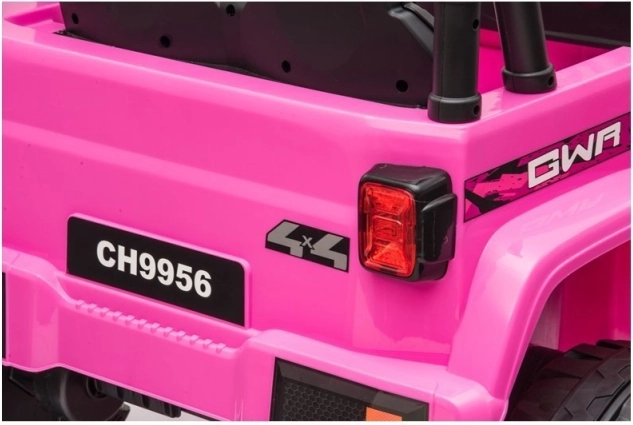 Stijlvolle elektrische kinderauto in het roze, geïnspireerd op een off-road voertuig, die kleine bestuurders zal verrassen met een robuuste look, grote wielen en realistische details. Biedt stabiel rijden, werkende koplampen en een stuur voor natuurlijke besturing. Ideaal voor buitenplezier en het ontwikkelen van motoriek dankzij de duurzame constructie, grote wielen en realistische elementen.