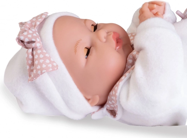 De Antonio Juan Bimba pop is de perfecte metgezel voor uw kind. Haar zachte stoffen lichaam en realistische knipperende ogen zorgen voor authenticiteit in het spel. Deze welwillende pop is ook interactief, omdat ze reageert op een magneetfopspeen en geluiden zoals "mama" en "papa" maakt, en de realistische kinderhuil die kan worden gekalmeerd door de speen weer terug te plaatsen: