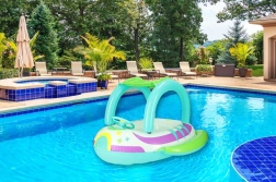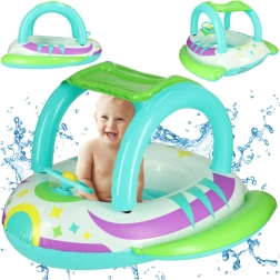 De praktische kap beschermt tegen de zon en maakt langer en veiliger spelen in het water mogelijk zonder oververhitting.