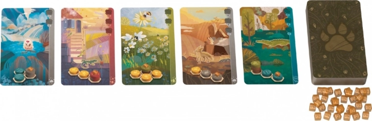 - Eén keer per beurt mogen we een van de openliggende dierenkaarten kiezen. Daarmee bepalen we onze doelen: onderaan elke kaart staat een opstelling van landschapstegels die we op ons bord moeten namaken zodat het betreffende dier verschijnt.