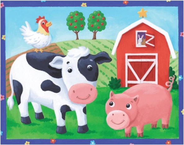 Ontdek de wereld van de boerderijdieren – een koe, een varkentje en een haan zullen kleine bouwers blij maken, terwijl een konijntje uit de rode schuur gluurt. De achtergrond met een heuvel en appelbomen stimuleert de fantasie en het vertellen van verhalen. De puzzel is ontworpen voor kleine kinderhanden, de stukjes zijn extra dik en makkelijk te leggen.