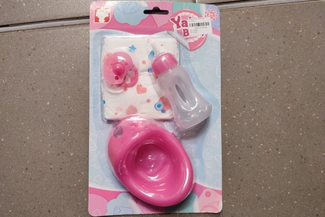 Deze set accessoires voor poppen bevat een potje, flesje, speen en luier, ideaal voor elke jonge verzorger vanaf 3 jaar.