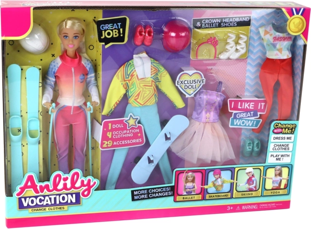 De sportieve Anlily-pop is een geweldige speelkameraad die kinderen veel creatieve pret biedt. Deze schattige pop heeft blauwe ogen, lang blond haar om te kammen en meet 30 cm x 4 cm x 6 cm. De set bevat diverse outfits en accessoires, waarmee kinderen verschillende rollen kunnen spelen en allerlei sporten kunnen ontdekken.