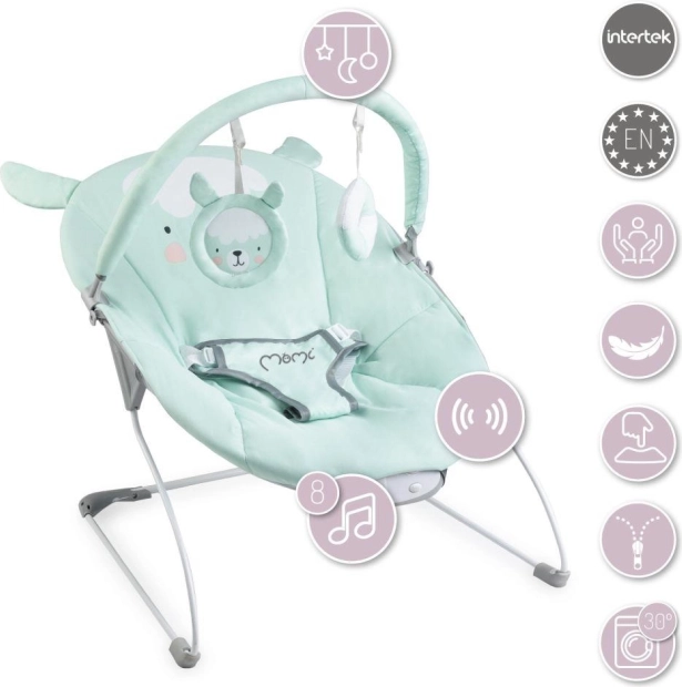 “Dus ik blijf hier lekker liggen en naar muziek luisteren, en jij doet wat je moet doen, oké?” Dat is een geweldig plan met de MoMi GLOSSY! Een licht, eenvoudig uit te klappen ligstoeltje met zachte bekleding, ergonomische rugleuning en een stabiele constructie. Schattig speelgoed, 8 zachte melodieën en milde vibraties zorgen voor volop vermaak en wiegen je kindje vervolgens in een zalige slaap.