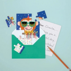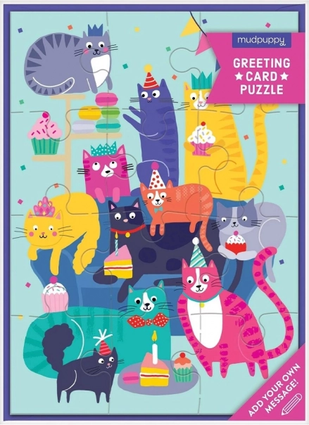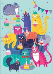 Leg de kleurrijke puzzel Kattenfeest en maak een originele wens voor je dierbaren. Elk van de 12 stukjes is precies uitgesneden en de kattenafbeeldingen fleuren elk huis op. Je kunt de puzzel eenvoudig in de bijgevoegde, kleurrijk bijpassende envelop plaatsen en per post verzenden.