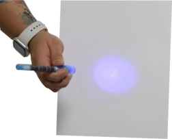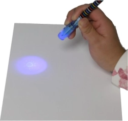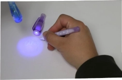 Onzichtbare inkt die alleen zichtbaar is onder de UV-lamp in de dop van de pen. Perfect voor geheime berichten en spionnenspelletjes.