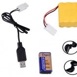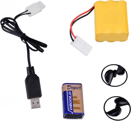 Inclusief 7,2 V accu, 9V-batterij voor de controller, USB-oplaadkabel, reservepropellers en een praktische standaard.