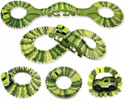 De maximale afmetingen van de opgebouwde baan zijn circa 80 × 85 × 8 cm, zodat hij zonder problemen in de kinderkamer past. De set ontwikkelt creativiteit, ruimtelijk inzicht en manuele vaardigheden – en biedt tegelijk een dynamische rit dankzij het veerkrachtige baanoppervlak met goede grip voor het voertuig.