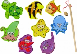 De houten set voor het vangen van zeedieren is uitgerust met een prachtig geïllustreerd bord dat de zeebodem voorstelt en kinderen een fascinerende kijk in de onderwaterwereld biedt. De diverse houten dierfiguren kunnen speels worden geplaatst en dankzij ingebouwde magneten met een houten hengel worden gevangen.