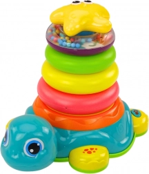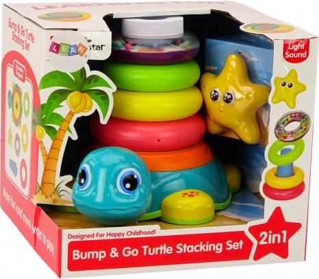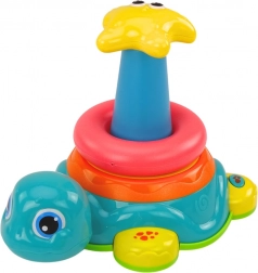 Piramide Rijdende Schildpad 2-in-1 is een dynamisch stuk speelgoed dat plezier combineert met leren. De basis in de vorm van een rijdende schildpad reageert op obstakels en biedt licht- en geluidseffecten, waardoor het spel interactiever wordt.