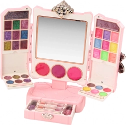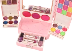 Stijlvolle roze schoonheidsset voor kinderen met een verstelbare tafelspiegel voor kleine beautyliefhebbers. Bevat lippenstiften, nagellakken, lipgloss, glitters en een kwastje, heeft een compact design en voldoet aan CE en EN71. Ideaal voor kinderen vanaf 3 jaar.