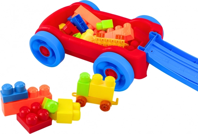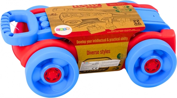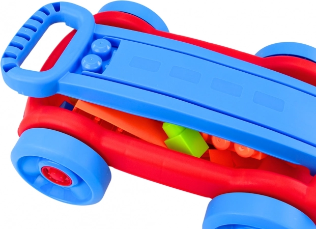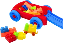Lichte kunststof kar met bouwblokken in blauw‑rood design die kinderen gemakkelijk trekken aan de praktische handgreep. De kleurrijke blokken stimuleren creativiteit en fijne motoriek, en alles kan bovendien handig in de kar worden opgeborgen. De CE- en EN71‑certificering garandeert veiligheid, ideaal vanaf 3 jaar.