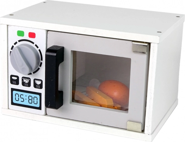 Stijlvolle houten magnetron in het wit, de perfecte aanvulling op elke kinderkitchen. Stimuleert rollenspel, heeft magnetische deur, een klikbare draaiknop en wordt geleverd met rijk accessoirespakket. Gemaakt van kwaliteits hout en veilig gelakt volgens de normen CE en EN 71, geschikt voor kinderen vanaf 3 jaar.
