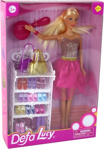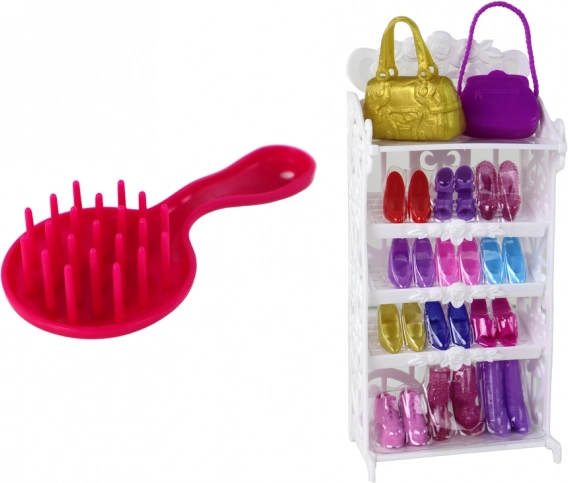 In deze set vindt u ook een schoenenkastje, dat 12 paar verschillend gekleurde schoenen bevat en twee tasjes - een paarse en een gouden. Elk kind kan met deze set verschillende modecollecties voor de pop creëren.
