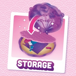 Een schelpvormige koffer dient als perfecte verpakking voor de pop en haar accessoires, waardoor deze gemakkelijk te vervoeren en op te bergen is.