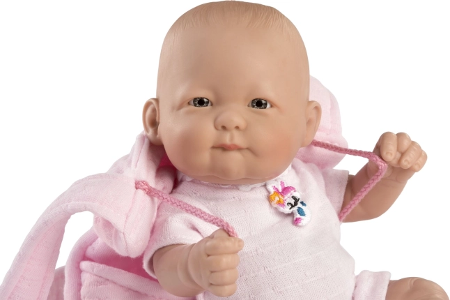 Deze prachtige pop heeft een volledig vinyllichaam, wat baden mogelijk maakt en alle schattige details van het kinderlichaampje, inclusief zachte plooien, vastlegt. De armen en benen zijn bevestigd met een scharnier, wat positioneren mogelijk maakt en de pop kan ook zitten.