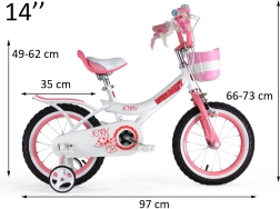 De stijlvolle kinderfiets ROYALBABY Jenny met 14'' wielen is ideaal voor de eerste ritjes. Biedt zijwieltjes, een praktische duwstang voor ouders, een stalen frame en een volledige kettingkast voor veiligheid. Een comfortabel zadel met handgreep, handremmen voor kleine handen en uitrusting zoals een mandje, bel en reflectoren zorgen voor een veilige en stabiele rit voor kinderen vanaf 3 jaar.