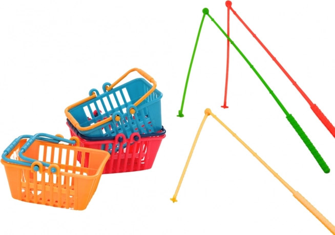 De set bevat 3 hengels en 3 mandjes in verschillende kleuren – ideaal om te wedijveren met vrienden en broertjes of zusjes.