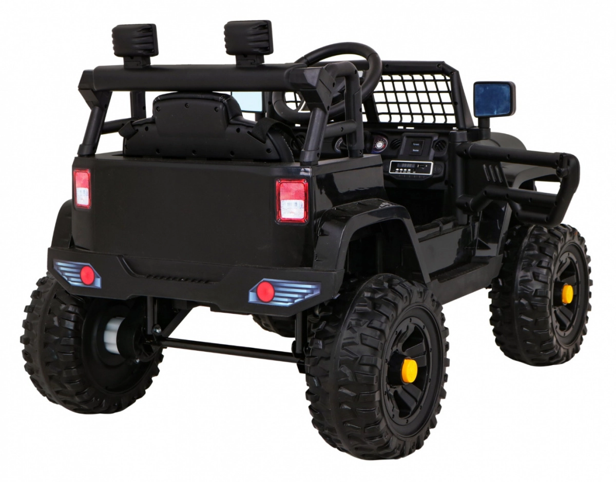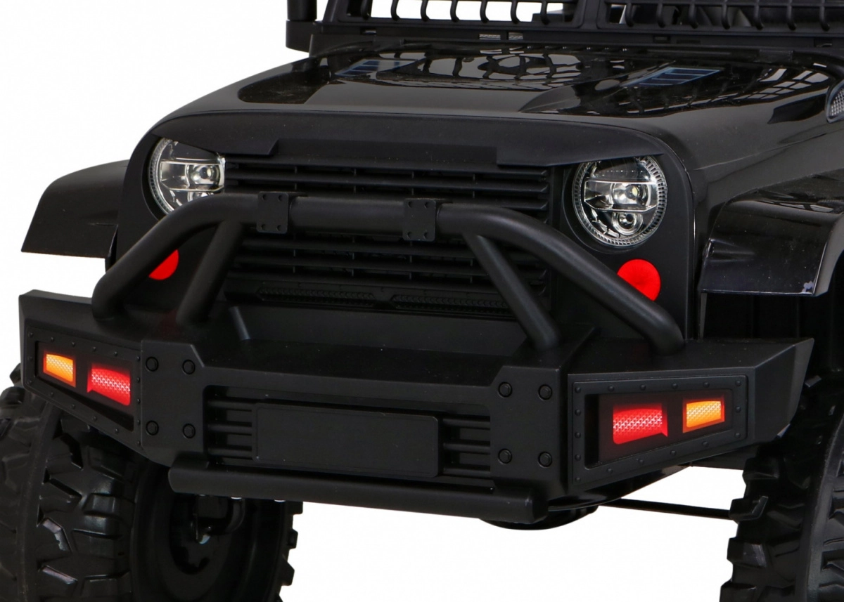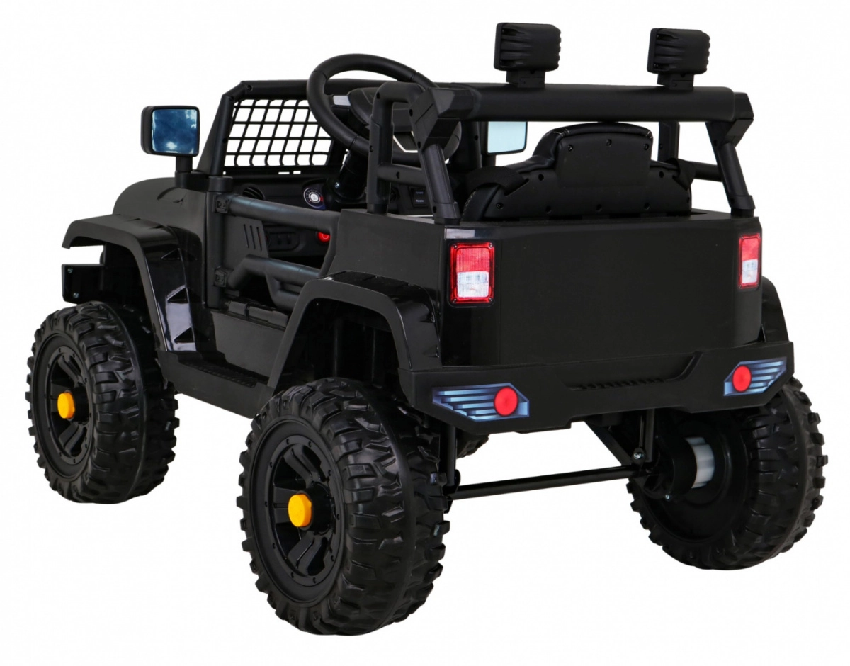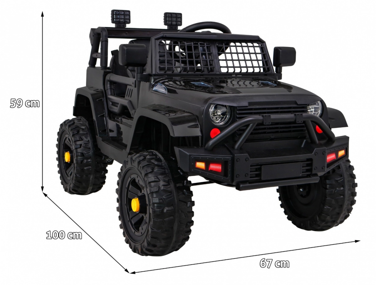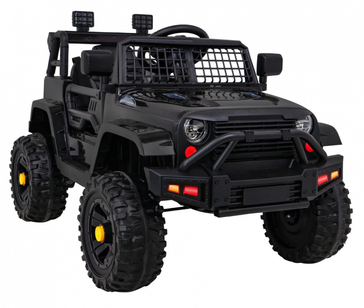 Stijlvolle elektrische kinderauto Jeep Dark Night in de uitvoering zwart biedt 2x35 W motoren, een krachtige 12V/7Ah accu, comfortabele EVA-wielen met vering voor en achter en een veilige zachte start. Kinderen zullen genieten van de LED-verlichting, openslaande deuren en een multimedia audiopaneel met USB/AUX. Het maximale draagvermogen is 28 kg.