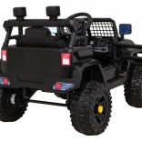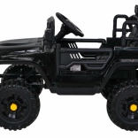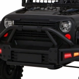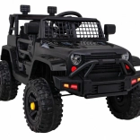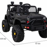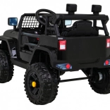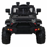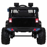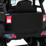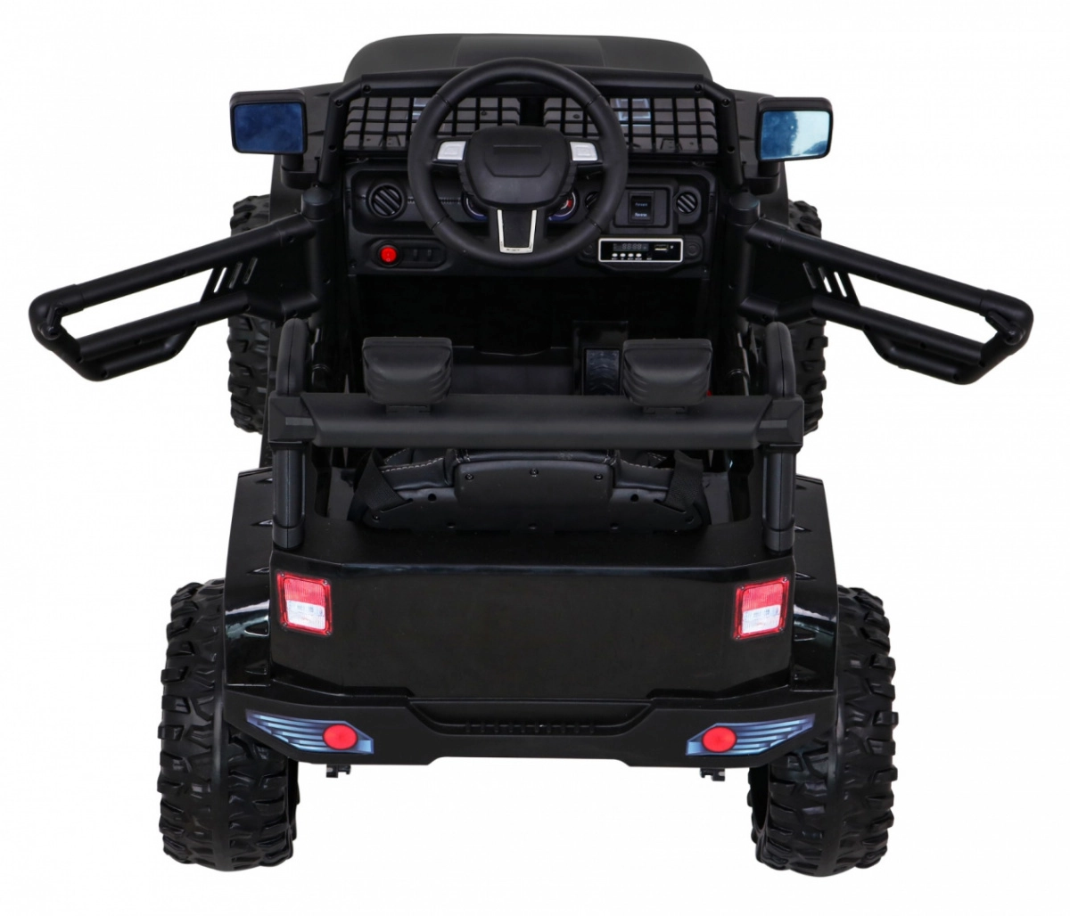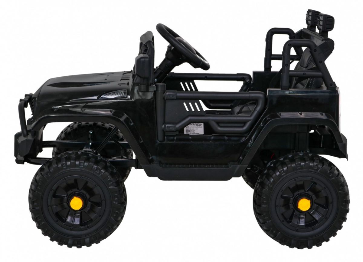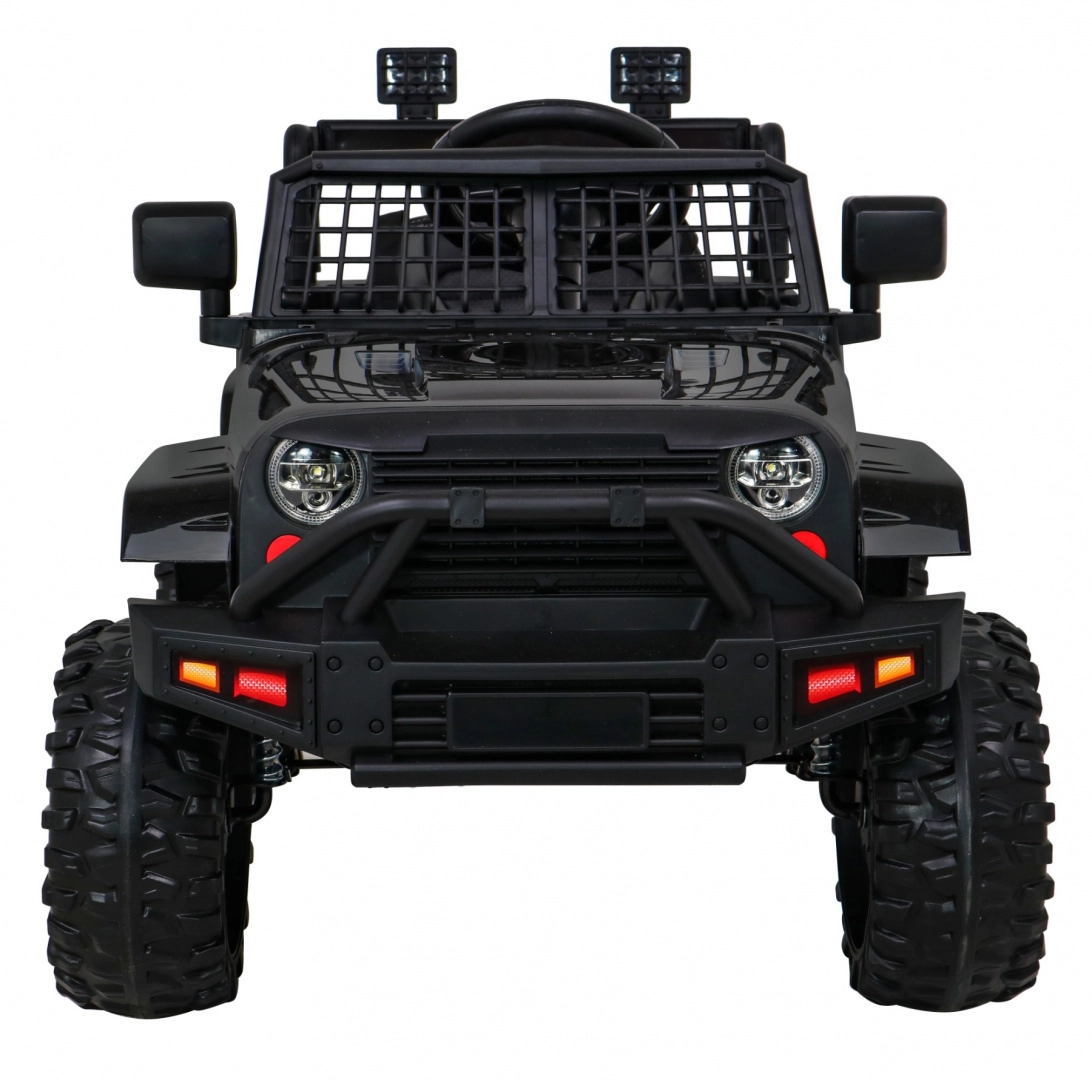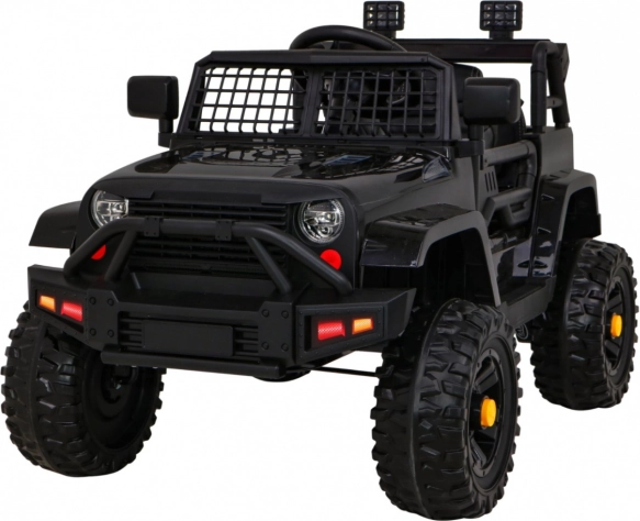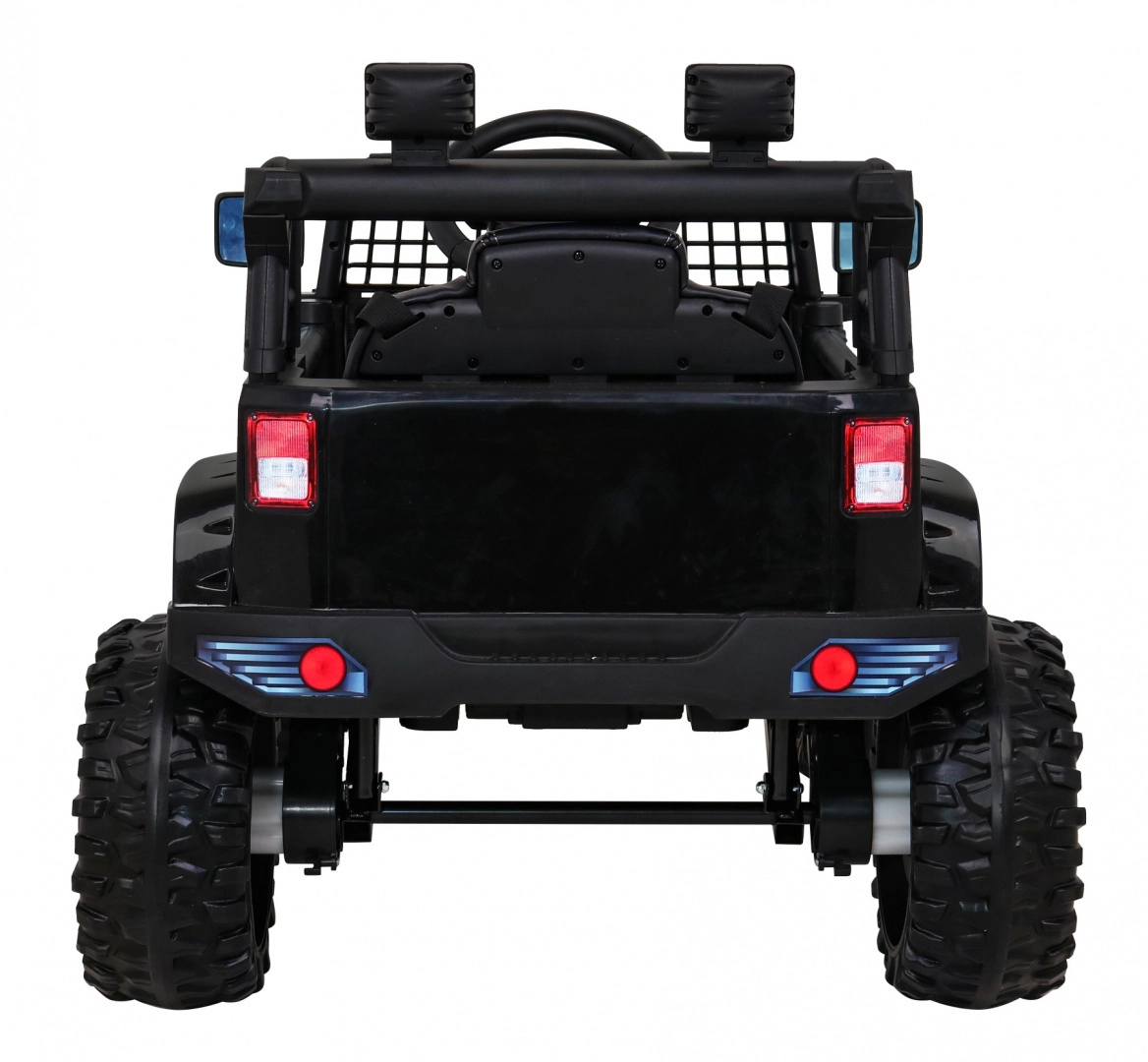 Stijlvolle elektrische kinderauto Jeep Dark Night in de uitvoering zwart biedt 2x35 W motoren, een krachtige 12V/7Ah accu, comfortabele EVA-wielen met vering voor en achter en een veilige zachte start. Kinderen zullen genieten van de LED-verlichting, openslaande deuren en een multimedia audiopaneel met USB/AUX. Het maximale draagvermogen is 28 kg.