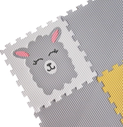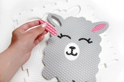 Deze witte schuimen puzzelmat met een vriendelijk lama-motief verzacht elke speelhoek. De losse delen klikken gemakkelijk in elkaar, zodat je in een handomdraai een veilig en zacht speeloppervlak creëert dat beschermt tegen kou en kleine valpartijen.