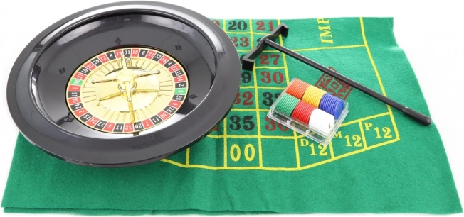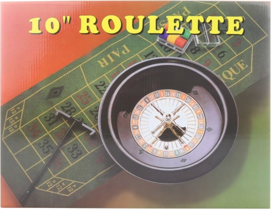 Gezelschapsspel Roulette. De set bevat een roulette met een diameter van ca. 25,5 cm, een speelkleed, een harkje, 2 metalen balletjes, 60 gekleurde fiches en spelregels. Afmetingen verpakking ca. 42,5 x 33 x 6 cm. Leeftijd 3+