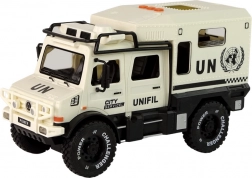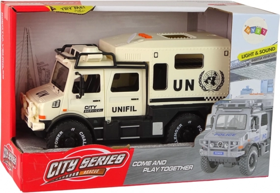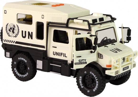 Deze robuuste terreinwagen in elegante beige kleur zorgt voor veel actie en plezier. Door op een van de drie knoppen op het dak te drukken gaan de voorste LED-lampen branden en klinken sirene‑geluiden, wat de realistische speelervaring versterkt. De openslaande deuren stimuleren creatieve verhalen en prikkelen de verbeelding van kinderen.