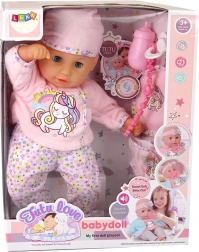 Ontdek deze prachtige kinderpop, de perfecte speelkameraad voor elk klein kind. De pop is uitgerust met een eenhoornmotief en geluidseffecten, waardoor spelen nog leuker wordt.