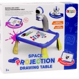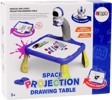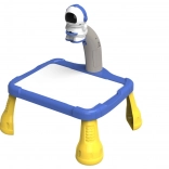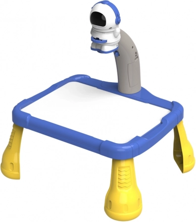 De projector heeft de vorm van een astronaut en projecteert afbeeldingen op papier, zodat kinderen eenvoudig ruimtemotieven zoals planeten, sterren, raketten en astronauten kunnen volgen en tekenen. De tafel is uitgerust met stabiele gele poten en een ruim blauw tekenoppervlak.
