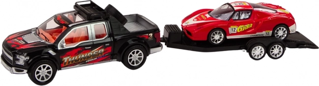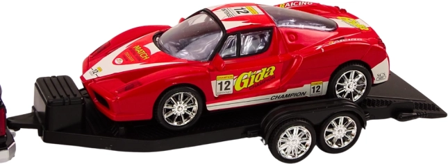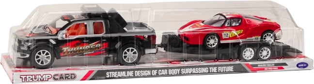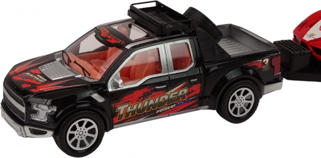 De pickup met grote zwarte wielen trekt moeiteloos de aanhanger met de sportwagen en dankzij de terugtrekmotor rijdt hij na het optrekken vooruit zonder batterijen. De afneembare aanhanger maakt snel wisselen van spel mogelijk – kinderen kunnen de auto vervoeren of met elk model apart spelen. De rode sportwagen valt op door elegante lijnen en is eenvoudig te laden en te lossen.