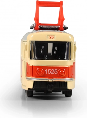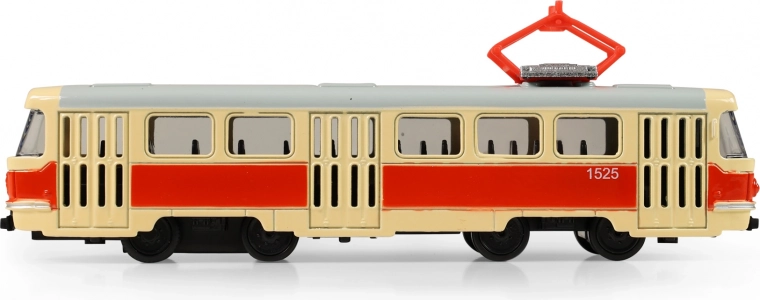 Getrouwe uitvoering met ramen, wielen en een functionerende pantograaf benadrukt het authentieke uiterlijk van de stadstram.