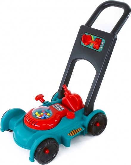 De maaier heeft een turquoise basis en een rood handvat, waardoor het speelgoed een vrolijke en aantrekkelijke uitstraling krijgt.