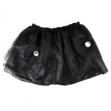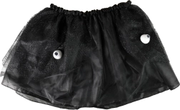 Het kostuum bevat een zwarte tutu-rok versierd met een spinnenwebmotief, wat zorgt voor een authentieke look en perfect past bij themafeesten.