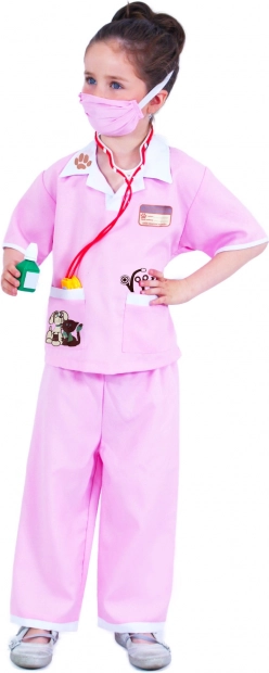 Schattig kinderkostuum voor kleine dierenartsen in maat S (4–6 jaar, 105–116 cm) in roze met dierenmotief. Set bevat blouse, broek en mondkapje. Praktische ECO-verpakking bespaart ruimte én de planeet en is ideaal voor webshops – minder plastic, meer plezier.