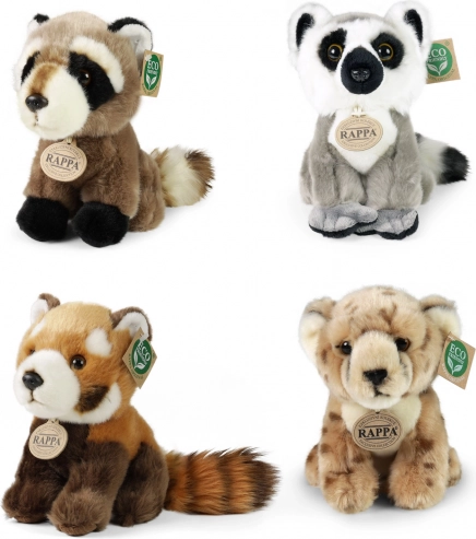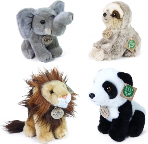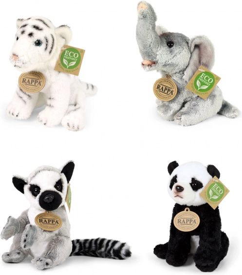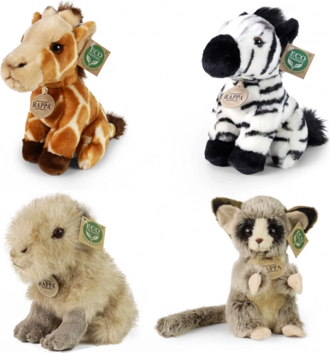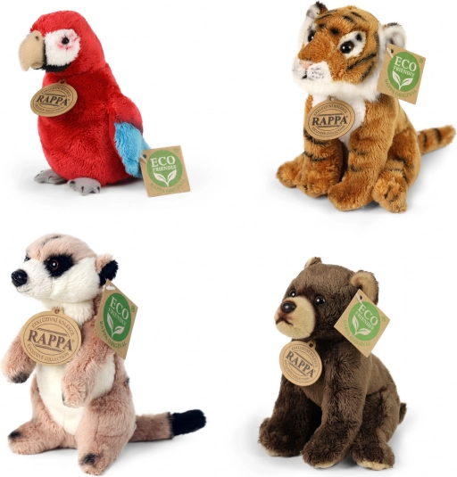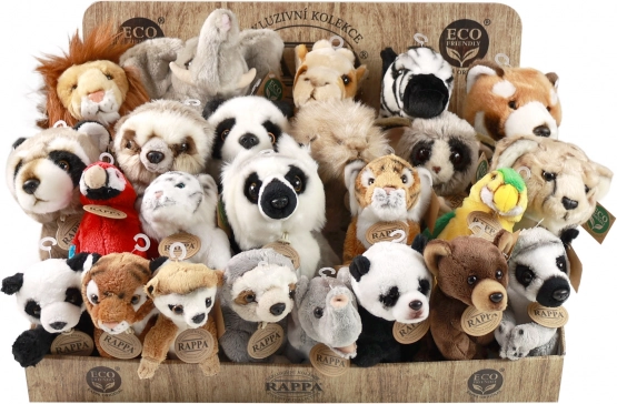 Complete verkoopdisplay met een selectie pluche exotische dieren van het merk RAPPA. Elke knuffel is gevuld met vezels van gerecyclede PET‑flessen, waardoor hij niet alleen zacht en aaibaar is, maar ook milieuvriendelijk. De display van stevig, gelamineerd karton is ideaal voor winkels en cadeauhoeken en trekt de aandacht dankzij de realistische afwerking en het eco‑label.