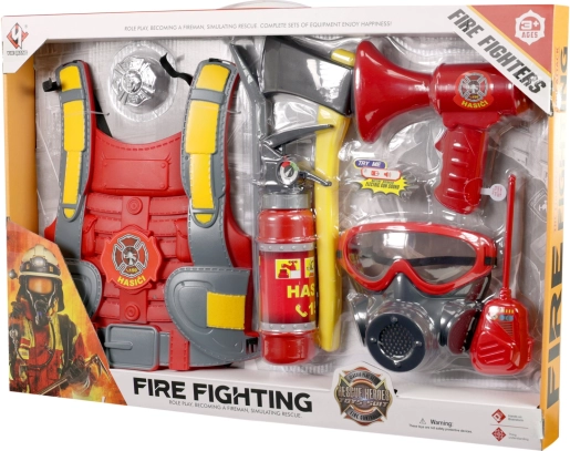 - Brandblusser (navulbaar met water), vest, brandweerbadge, walkietalkie (imitatie), bijl (speelgoed), breekijzer (speelgoed), beschermend gezichtsmasker (speelgoed), megafoon