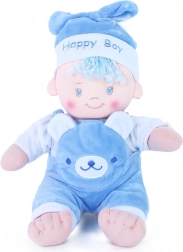 Het pakje met beertje en het mutsje met de tekst “Happy Boy” geven de pop een vriendelijk uiterlijk waar kinderen dol op zijn.