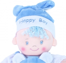 Deze superzachte lappenpop verblijdt elk kind met haar vriendelijke uitstraling en aangename aanraking. De blauwe outfit met schattig beertje en mutsje geeft de pop een eigen charme, terwijl de geborduurde details zorgen voor comfortabel en veilig knuffelen.