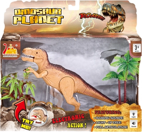 De interactieve Tyrannosaurus rex in een bruine uitvoering brengt elk kinderavontuur tot leven. Dankzij het realistische oppervlak dat aan schubben doet denken, de luide effecten en de lichtgevende ogen, brengt hij de speelse sfeer van het stenen tijdperk rechtstreeks naar de kinderkamer. Druk simpelweg op de kaak en de T-Rex laat zijn kracht zien.