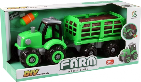 Ontdek de groene schroeftractor met houtaanhanger die plezier combineert met leren. Dankzij het eenvoudige schroefsysteem kunnen kinderen het voertuig zelf uit elkaar halen en weer in elkaar zetten, leren ze met gereedschap werken en oefenen ze geduld en coördinatie.