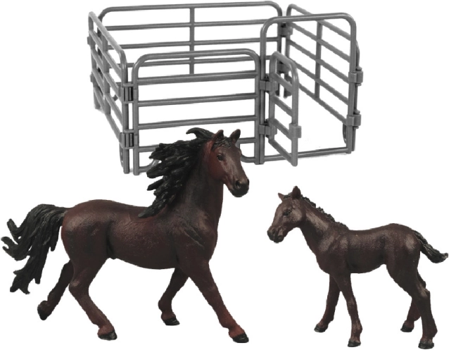 Verrijk je speelgoedcollectie met deze prachtige set paarden met omheining. Het paard en veulen figuurtje zien er realistisch uit en met hun afwerking verblijden ze alle leeftijdscategorieën. De verpakking bevat: