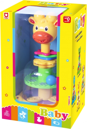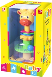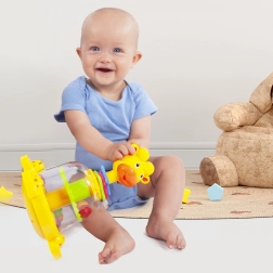 De bonte draaimolen in de vorm van een giraffe vermaakt zelfs de allerkleinsten: bij het indrukken van de kop gaan de gekleurde balletjes draaien, stuiteren en maken ze een ratelend geluid. Eenvoudige mechanische bediening zonder batterijen stimuleert de ontwikkeling van de fijne motoriek en de oog-handcoördinatie.