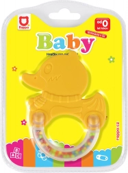 De vrolijke rammelaar en bijtring in de vorm van een eendje verrukt elke baby met zijn kleuren en zachte gerammel. De verschillende oppervlakken van de bijtring bieden verlichting bij het doorkomen van tandjes en stimuleren het kind om te grijpen, waardoor de fijne motoriek wordt ontwikkeld. De lichte en ergonomische vorm is ontworpen voor veilig en comfortabel vasthouden door kleine handjes.