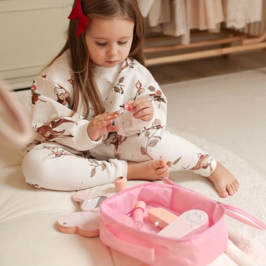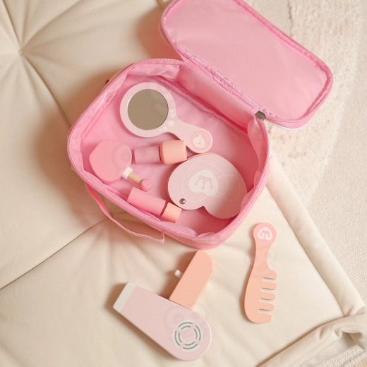 Deze kindermake-upset in een schattig roze tasje bevat maar liefst 12 zorgvuldig gemaakte houten accessoires. Kinderen kunnen “make-up aanbrengen”, kammen en het haar “föhnen” en volwassenen nadoen op een volledig veilige en fantasierijke manier. Dankzij het compacte formaat is de set ideaal voor thuis en onderweg.