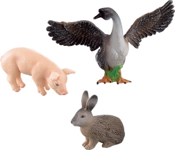 Bevat drie realistische plastic figuren: een biggetje, een konijntje en een gans met gespreide vleugels, uitgevoerd in natuurlijke kleuren.