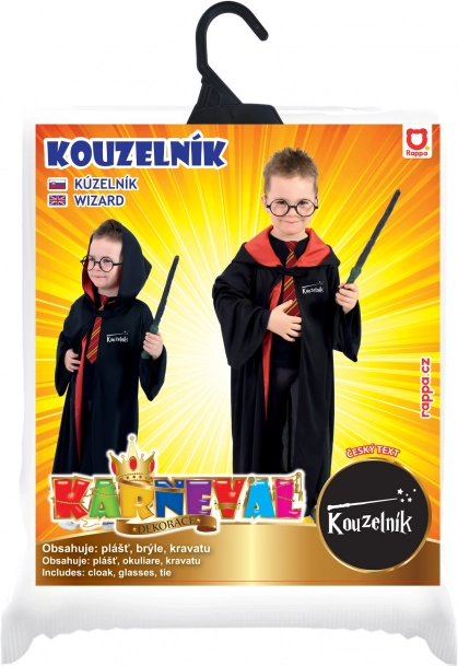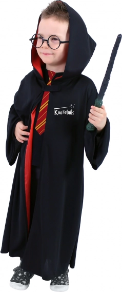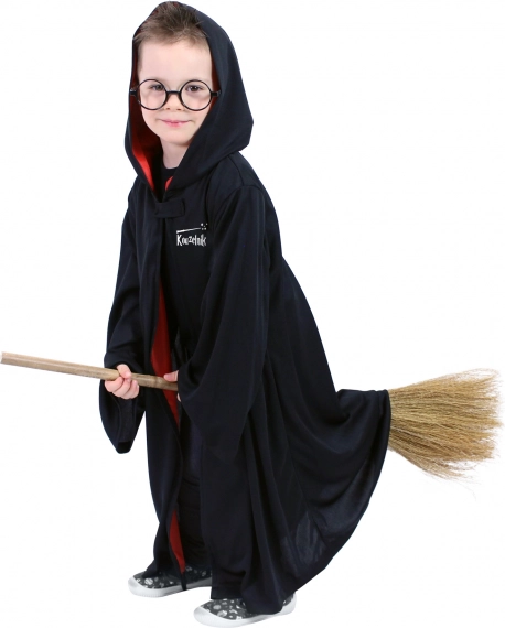 Geef kinderen een magisch avontuur met deze kinder tovenaarscape met capuchon in zwart‑rood. Hij heeft sluiting bij de hals, de tekst Tovenaar aan de linkerkant en wordt geleverd met bril en stropdas. Geschikt voor kinderen van 3–7 jaar (104–136 cm) voor carnaval, verkleedfeestjes en Halloween.
