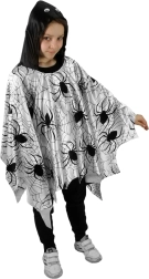 Op zoek naar een eenvoudig en opvallend kostuum voor kinderen? Deze lichte cape/poncho met zwarte print van spinnen en spinnenwebben op een witte basis valt meteen op. Dankzij de losse snit trek je hem gemakkelijk over het hoofd aan en biedt hij onbeperkte bewegingsvrijheid tijdens spel, dans en optochten.