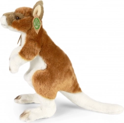 De eco‑friendly vulling van gerecyclede PET-flessen garandeert milieuvriendelijkheid, terwijl zachtheid en comfort op topniveau blijven. De kangoeroe staat rechtop en heeft een kenmerkende staart en oortjes, wat zijn levensechte uitstraling benadrukt.