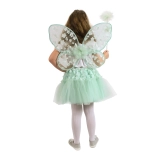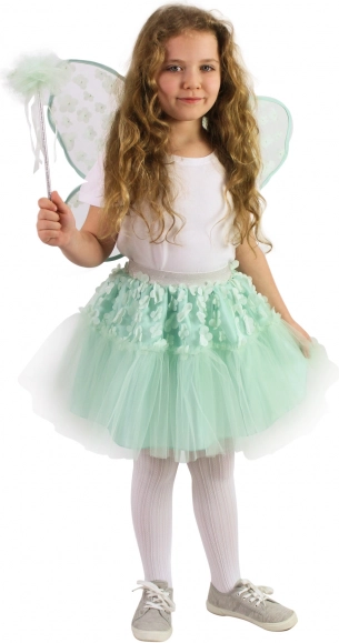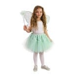Tover elk meisje om tot een charmante fee met dit prachtige kostuum. De groene tule rok met satijnen onderrok is versierd met kleine bloemetjes en heeft een zilveren elastiek in de taille voor comfortabel dragen. De vleugels en de toverstaf zijn perfect afgestemd op het totale thema.