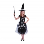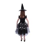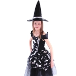 Dit prachtige heksenkostuum met vleermuismotieven is een perfecte keuze voor meisjes van 6-8 jaar met maat 117-128 cm. De zwarte jurk met een luchtige rok is versierd met zilverkleurige elementen en de perfect bijpassende hoed met een elegante zilveren lint maakt de look compleet.